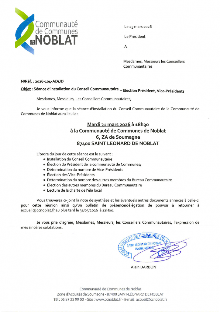 La séance d’installation du nouveau Conseil Communautaire, Élection du Président, Détermination du nombre de Vice-Présidents, Élection des Vice-Présidents, Détermination du nombre des autres membres du Bureau Communautaire,Élection des autres membres du Bureau Communautaire, et lecture de la charte de l’élu local, se déroulera le mardi 31 mars 2026 à 18h30 au siège de la Communauté de Communes de Noblat.