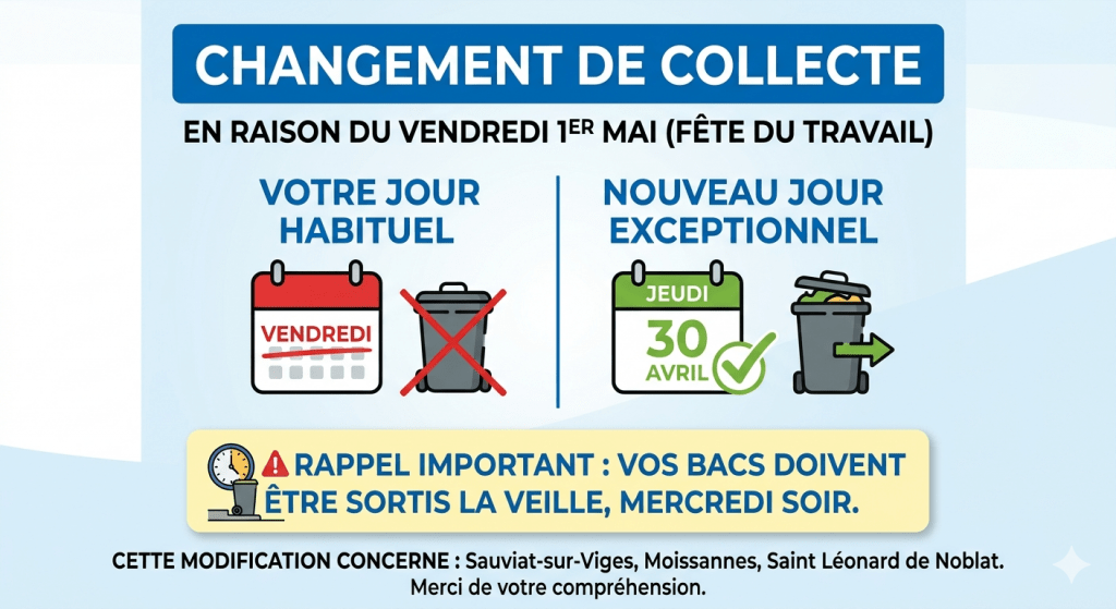 En raison du vendredi 1er mai 2026 (Fête du Travail), jour férié, l’organisation des tournées de ramassage des ordures ménagères est modifiée pour plusieurs communes de notre secteur.
