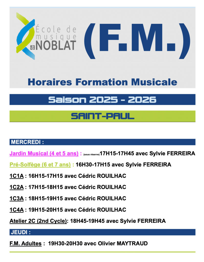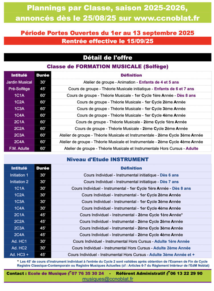 Contacts : Pour plus d’information, nous contacter via musiques@ccnoblat.fr. Numéro de l’école (Site d’enseignement de SAINT PAUL) : 07 76 35 30 24 ou au 05 87 22 99 00 (CCN).